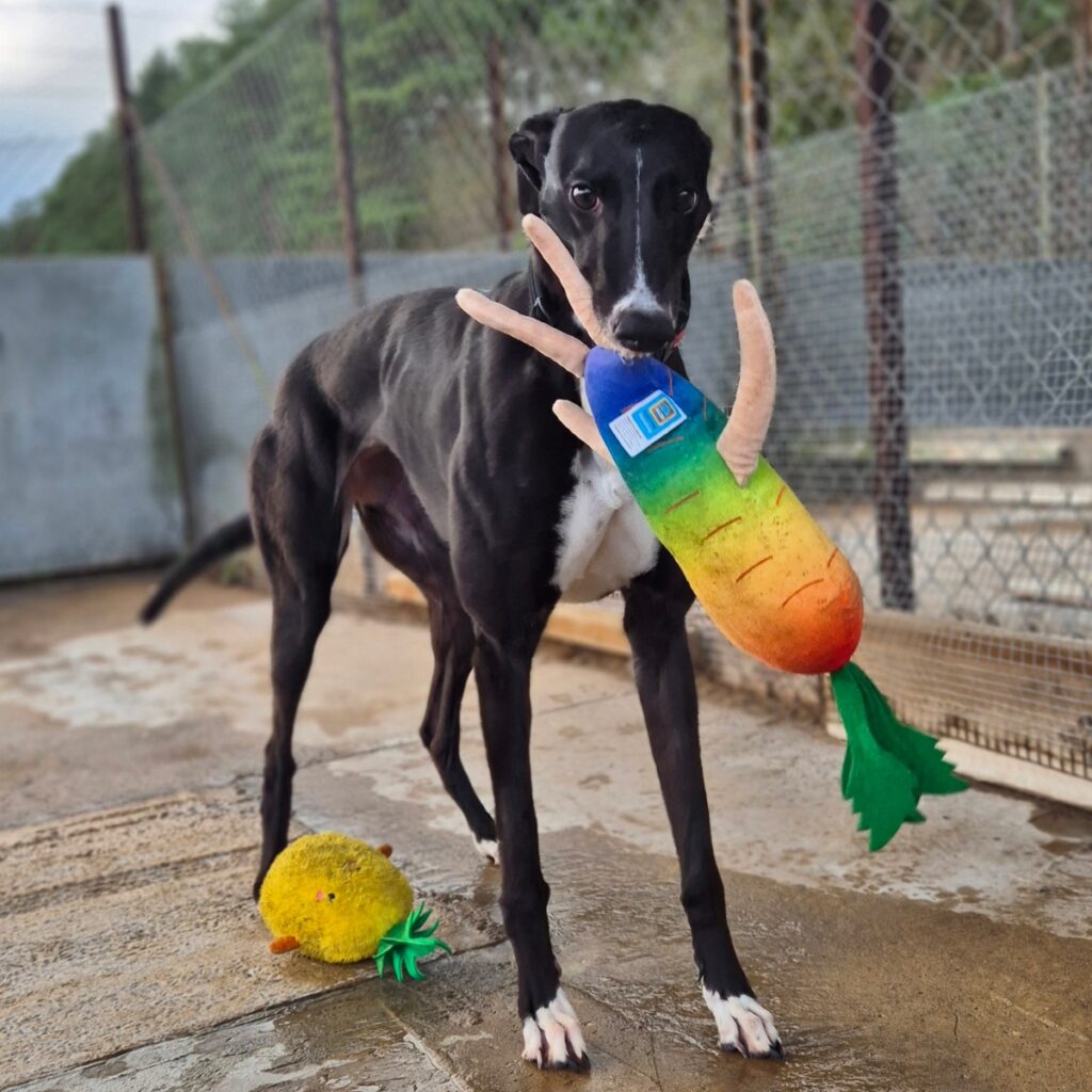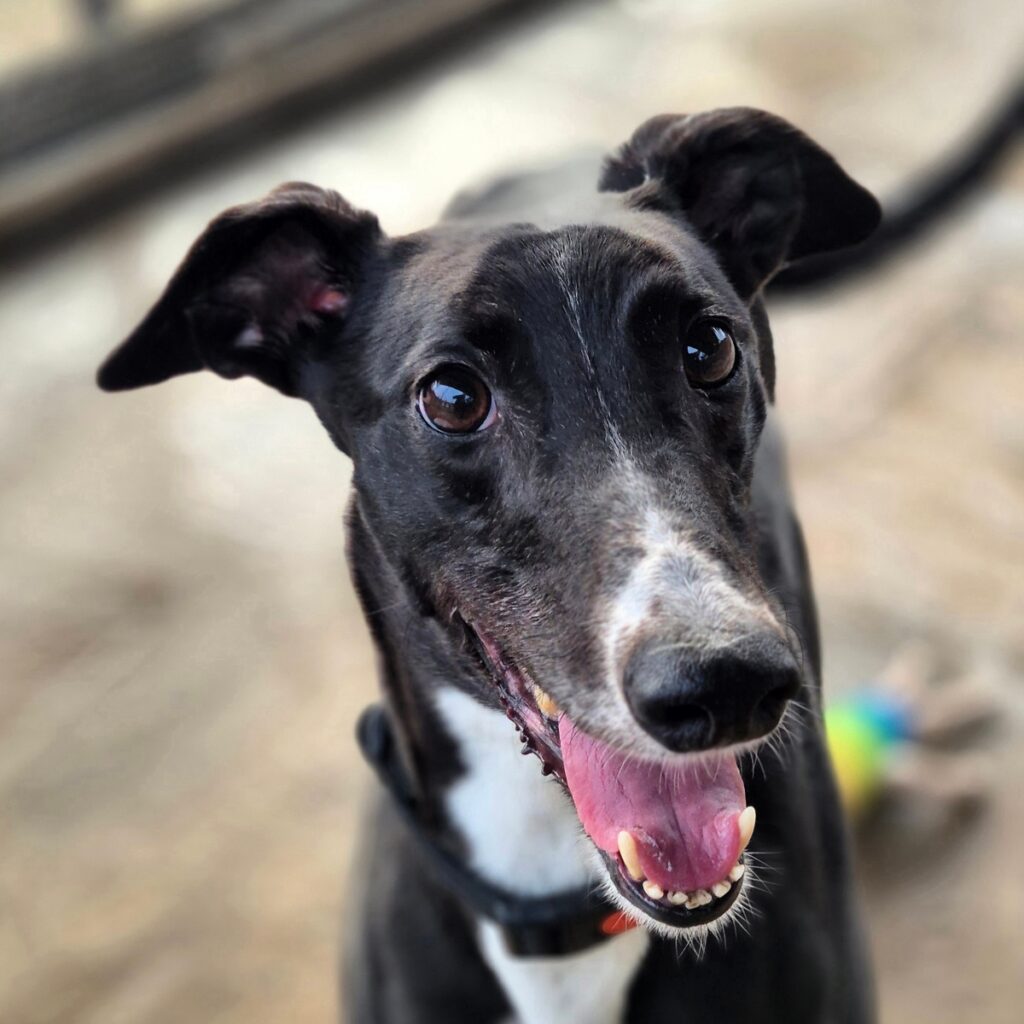 Aoife may be able to live with other greyhounds and children.. He is sweet natured, quiet and inquisitive.